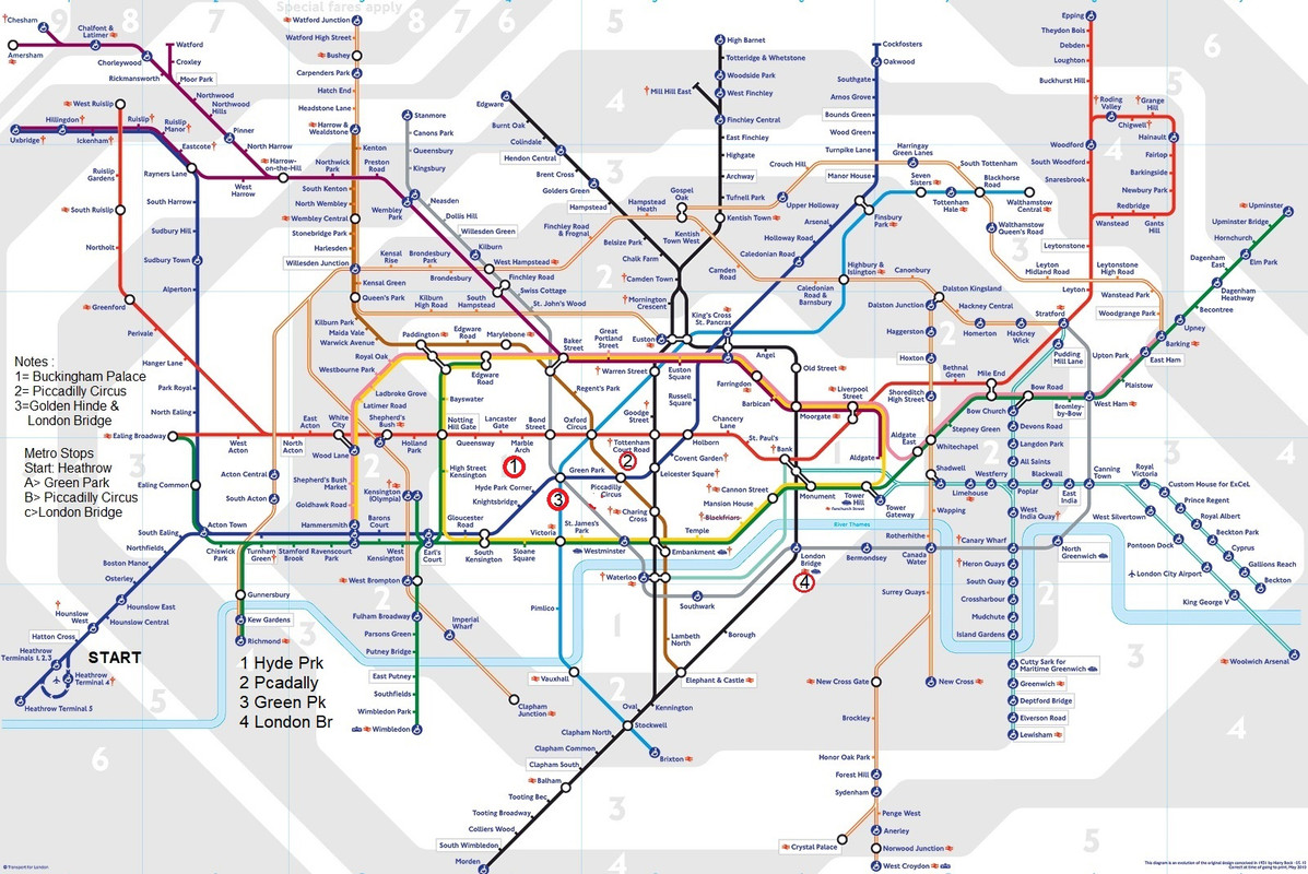 मैं लंदन एयरपोर्ट एक्सप्रेस मेट्रो के हीथ्रो टर्मिनल ५ पर चला गया और टूरिस्ट इनफार्मेशन काउंटर से उठाये मेट्रो का रूट मैप देख रहा था तभी एक देशी लड़का - लड़का ही था मेरे पास आया और कुछ होटल का एडवाइस मुझे देने लगा। मैंने देखते ही पहचान लिया की ये एक बंगाली लड़का है और मैंने बंगला मैं उससे बोलना शुरू कर दिया। "Kemon achhen , amar dos ghantar overlay achhe aikhane ,hotel chai na " कैसे है मुझे दस घंटे का ले ओवर है और मुझे होटल नहीं चाहिए। इस बांग्ला बातचीत का बहुत असर हुआ। उसका नाम था भट्टाचार्जी , संक्षेप में हमारा परिचय हुआ। वह एक छात्र था और आज रविवार था और वह कुछ अतिरिक्त आय के लिए किसी होटल के एजेंट का काम कर रहा था । अब उसने जो बातें बताईं वो ईमानदार एडवाइस था। उसने बतया की एयरपोर्ट एक्सप्रेस का टिकट का दाम १६ पौंड लगेगा और वह सिटी सेण्टर तक ही जाएगी । उसने मेरे हाथ से मेट्रो का रूट मैप लेकर उसपर उन सभी स्टेशन को मार्क कर दिया जहाँ उतर कर मुख्य मुख्य जगह देखा घूमा जा सकता है और मुझे बताया की नीचे अंडरग्राउंड से नार्मल मेट्रो ट्रैन लेना बेहतर ऑप्शन है और क्योंकि रविवार है पुरे दिन कहीं भी घूमने का टिकट सिर्फ ६ पौंड में मिल जायेगा। इतनी कीमती सलाह लेकर मैं निकल पड़ा लंदन घूमने।